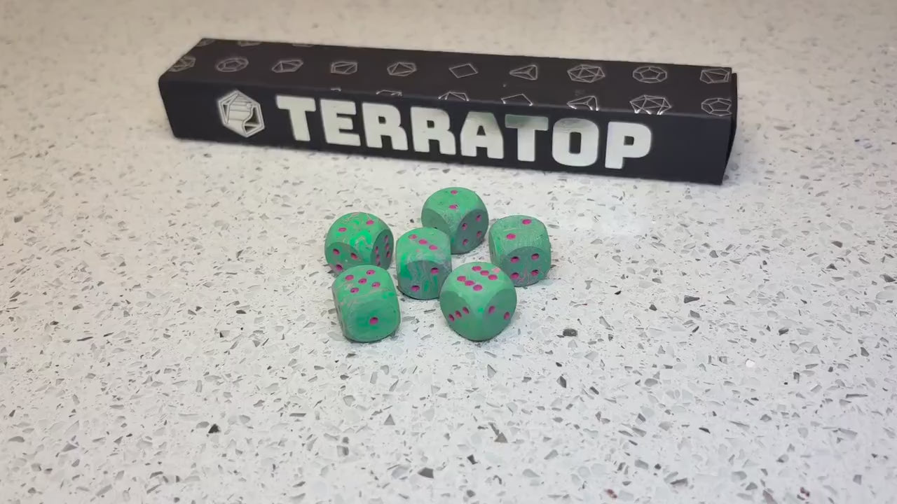 These handmade Jesmonite dice pieces are crafted for Dungeons & Dragons, Warhammer and other tabletop RPGs. Jesmonite offers a smooth, stone-like feel and a striking, matte sheen at the table.